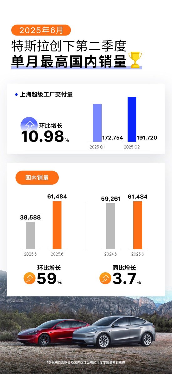新浪科技讯 7月3日上午消息,据乘联会最新数据显示线下股票配资平台,特斯拉上海超级工厂第二季度交付量为19.1万辆,较一季度环比增长10.98%;其中6月国内销量为6.1万辆,环比上涨59%,同比上涨3.7%,创下二季度单月最高国内销量。